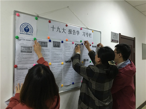 医药信息学教工党支部在系会议室举办了十九大专题组织生活会。系主任王伟教授围绕十九大报告的“四个新”——理清了“新矛盾”、划分了“新时代”、提出了“新理论”、勾画出“新征程”谈了自己的体会,并和大家讨论了其深刻的内涵;于双成教授通过学习和研读,认为十九大报告中呈现出20个字:校正方向、认清态势、提升自信、明确方向、真抓实干,并对每一方面进行了剖析和解读;曹锦丹教授以十九大报告中40个新提法新举措为切入点,并从科研工作者和高校教师的角度谈了今后的努力方向;张云秋教授结合十九大报告从“报告主题突出、思想深邃”,“报告总结精辟、鼓舞人心”等方面谈感受;李钊老师从“全面建成世界一流军队”、“人类命运共同体”等方面,联系会内解读和会外舆情谈了自己的见解;支部书记李玉玲以报告中有关党建工作的内容为侧重点,结合近期参加学校党支部书记培训的收获,对支部的近年来的工作进行了分析和梳理。老党员王伟提出三点感悟,得到大家认同:一是十九大报告内容丰富,需要进一步系统学习,深刻领悟,这也是自己今后政治学习的一个重要任务;二是教师“教书育人”责任重大,“四个新”如何在教书育人实践中贯彻落实,要有新的精神面貌、新的思想方式、新的思想观念、新的实施路径,做一名合格的大学教师;三是加强自我学习,集中学习,深刻领悟,寻找自身的不足,发挥共产党员的先锋模范作用。会后,支部老师还与学系研究生共同组织材料,以“十九大报告学习专栏”为主题布置了宣传栏。