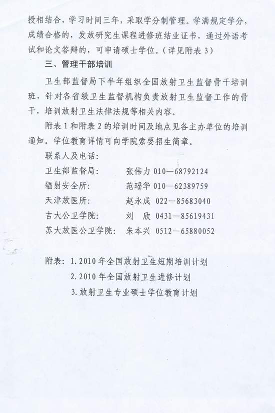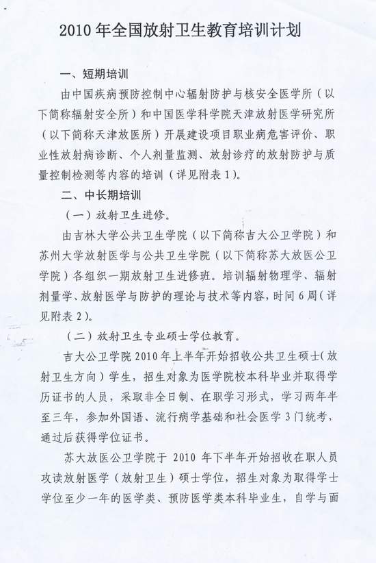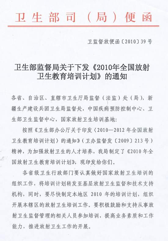 卫生部监督局关于下发《2010年全国放射卫生教育培训计划》的通知