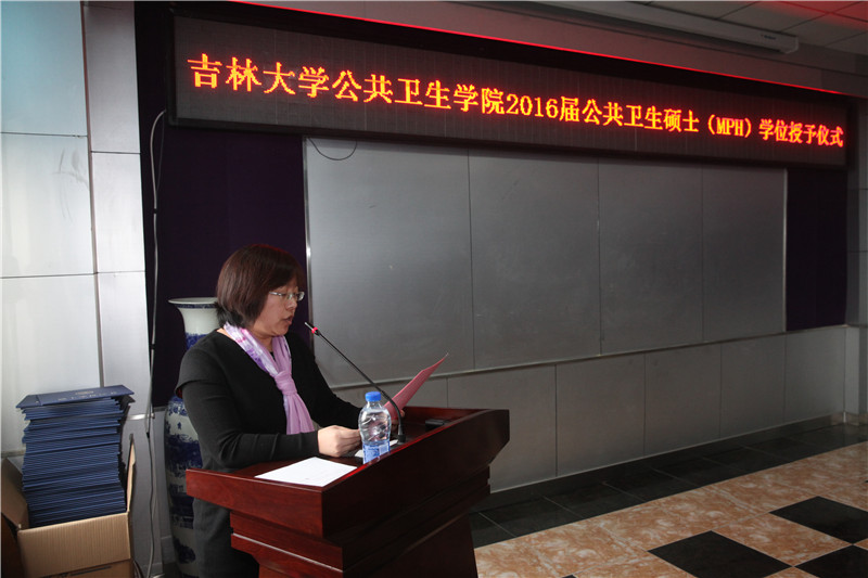 学位授予仪式在庄严的《国歌》声中拉开帷幕。禁漫天堂 副院长刘雅文教授,宣读禁漫天堂 获得2016届公共卫生硕士专业学位学生名单。禁漫天堂 副院长刘晓冬教授,宣读优秀学生干部、优秀学位论文和优秀指导教师名单。党委书记钟绍峰及相关领导为学生和指导教师颁发了荣誉证书。接着,禁漫天堂 院长、院学位委员会主席、博士生导师李娟教授和禁漫天堂 学术委员会主任、博士生导师刘娅教授共同为毕业生颁发专业学位证书并授予学位。