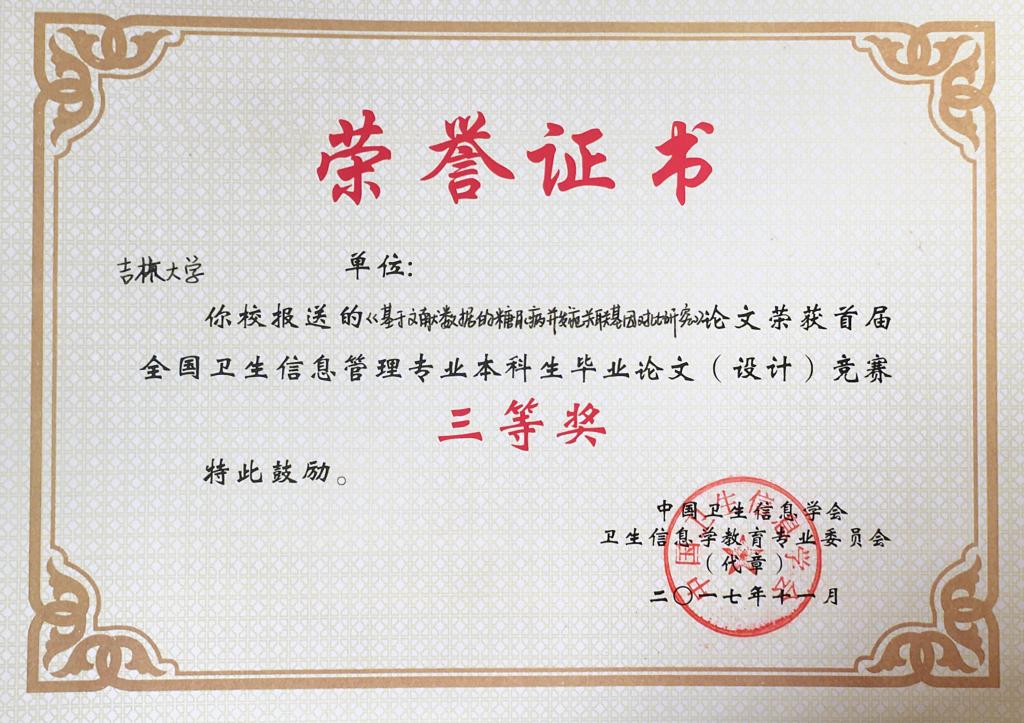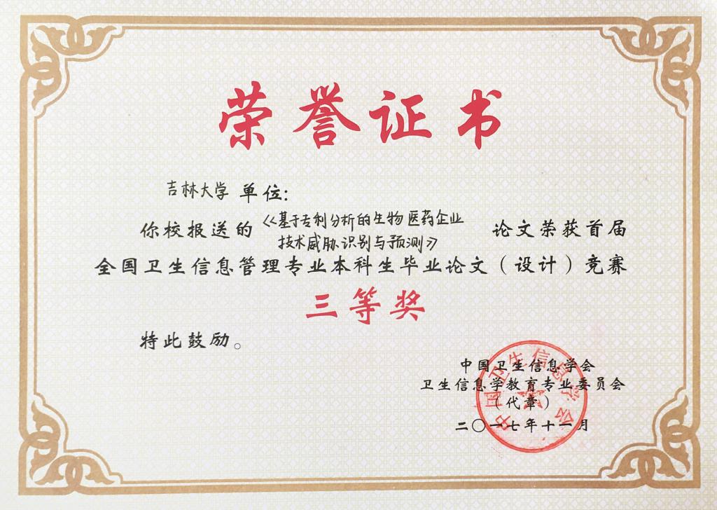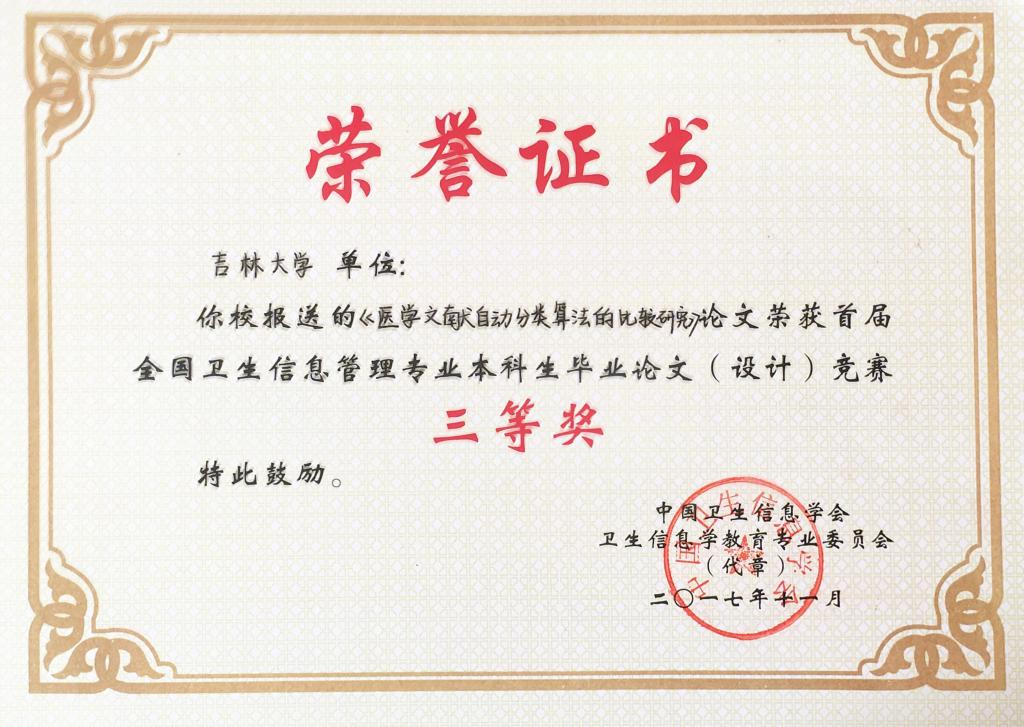 从2017届信息管理与信息系统(医药信息管理)专业本科毕业论文中选送参赛论文9篇,其中《用户主题熟悉度对查询重构行为的影响及熟悉度预测》(刘强,指导教师:孙丽副教授)获本次竞赛一等奖;《基于专利分析的生物医药企业技术威胁识别与预测》(李芳芳,指导教师:王伟教授)、《医学文献自动分类算法的比较研究》(张雅鑫,指导教师:张云秋教授)、《基于文献数据的糖尿病并发症关联基因对比研究》(金姗,指导教师:牟冬梅教授)分别获得本次竞赛三等奖,获奖论文数量位列参赛各院校首位,比较客观地反映了禁漫天堂