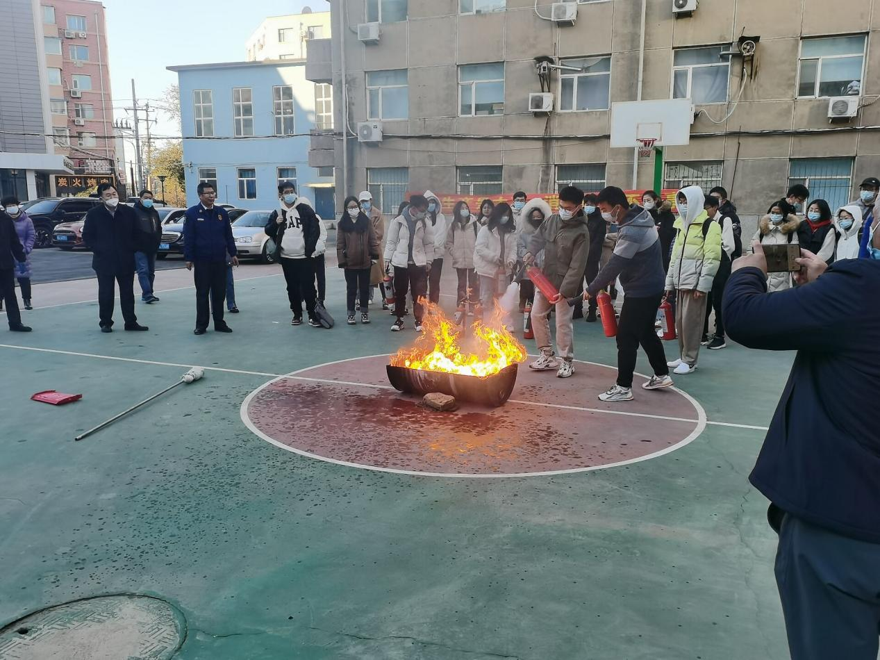 师生组织开展了火灾逃生演练和灭火器使用现场教学。