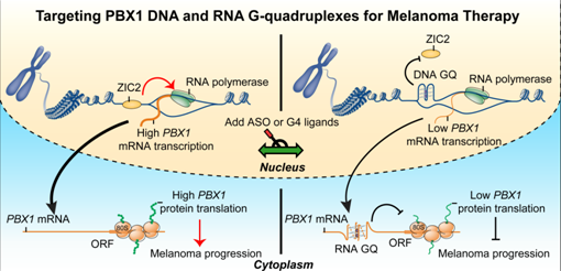 通过生物信息学和细胞生物学实验,课题组研究发现:黑色素瘤细胞中PBX1的启动子区和转录本中存在高度保守的G4s基序,且G4s形成会抑制PBX1的转录和翻译,显著减少PBX1蛋白的表达。进一步研究发现小分子化合物TMPyP4和PDS可以结合并稳定PBX1的G4s基序,显著抑制黑色素瘤细胞在体内外的生长和迁移(转移)。由于TMPyP4和PDS稳定PBX1转录本G4s基序特异较差,课题组设计出特异性靶向PBX1转录本G4s的ASO。该ASO可以特异性诱导PBX1转录本G4s的形成,显著抑制病人来源黑色素瘤异种移植模型中黑色素瘤的生长。上述这些重重要发现不但有助于深入解析黑色素瘤的致病机制,也为黑色素瘤预后判断以及靶向核酸高级结构抗癌药物的研发提供了新的线索和思路。博士研究生隋雨彤为本论文的第一作者。