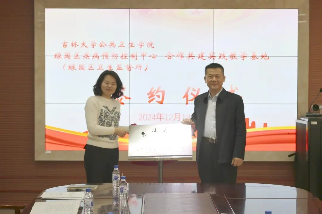 随后,在与会嘉宾的共同见证下,刘雅文院长与区疾控中心(卫监所)宋立辉主任共同签署了合作协议,学院党委书记赵国利与绿园区卫健局局长刘雪芹共同为基地揭牌。