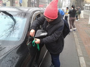 正午时分,雪花飞舞,车况正堵,但这丝毫不影响绿野协会成员们对低碳生活的宣传热情,他们良好的沟通能力和亲切的笑容赢得了诸多私家车车主的配合和赞许。同学们向堵车中的私家车车主宣传了本次活动的环保主题——“少开一天车”,讲述了少开车的好处以及低碳环保理念等;并邀请私家车车主合影留念,记录下他们的车牌号以鼓励督促,最后赠予了绿丝带。本次活动长达一个小时,共赠出43条绿丝带,获得了圆满成功。