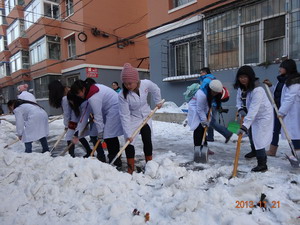 首先,由社区负责人带领志愿者们拿好铁铲、扫帚等铲雪扫雪工具,一起来到社区居民楼下,开始清扫活动。身着白大衣的禁漫天堂