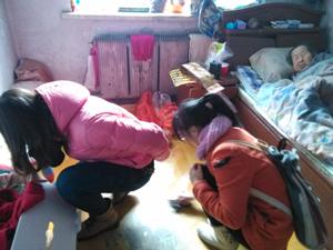 在同光路西社区工作人员引导下,大家带着礼物和满满的祝福来到了各位老人家中。第一组探望的是孤寡老人孙奶奶,老人独自一人生活着,没有亲人照顾,住在不足30平米的小屋子里面,孙奶奶已经80岁了,行动能力不便,腿脚不好也不经常出去,视力模糊,经常躺在床上,平时除了社区的工作人员外很少有人去探望。志愿者们为孙奶奶带去了水果、油和春联,帮她打扫了卫生,尤其是老人平时够不到的地方格外仔细的清理。随后又为孙奶奶贴上了春联,让她可以开心的度过春节。最后,大家热心地询问她有什么困难,并留下了联系方式。紧接着,大家又拜访了其它几位老人。每去一家,同学们都积极而又热情的帮老人做些能做的事情。伴随着夕阳,本次活动在温馨中拉下了帷幕。