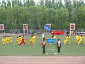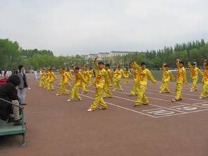 代表队蓄势待发——弓、马、虚、仆、歇五种步型步沉千钧;冲、劈、抡、砸、栽五种拳法拳拳有力;弹、踹、蹬、踢、拍五种腿法轻灵若絮;动如疾风般迅速,静如山岳般沉稳,高有顶天立地的气概,低有鱼翔浅底的本领。每个动作都能达到“手、眼、身法、步、精神、气、力、功”八法的协调,整个过程体现出动与静、重与轻、快与慢、起与伏的完美结合。代表队表演完毕后获得了评委老师的肯定和在场观众的阵阵掌声。最后,待各个学院均表演结束,所有参赛队伍齐集上场,进行了运动会之前的合练。