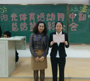 大会开始,刘丽副书记针对同学们在“阳光·自由”体育活动中的精彩表现做了总结发言。她从同学们的突出成绩切入,强调了锻炼对提高身体素质的重要性,并且号召大家在今后的学习生活中加强体育锻炼,发扬体育精神。之后,大会依次颁发了最佳组织奖、最佳创意奖和最佳合作奖三个团体奖项,以及突出个人奖。在突出个人奖中,刘丽副书记亲自为被评为“体育之星”的13级的范霞同学颁奖,并与之合影。范霞同学也和同学们分享了她对体育运动的体会和感悟,表示这次的活动充分发挥了自己独特的才能,展现出了女生独有的运动风貌。