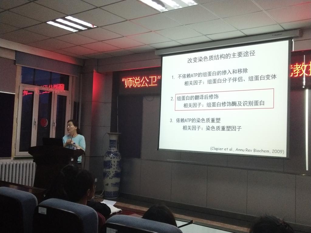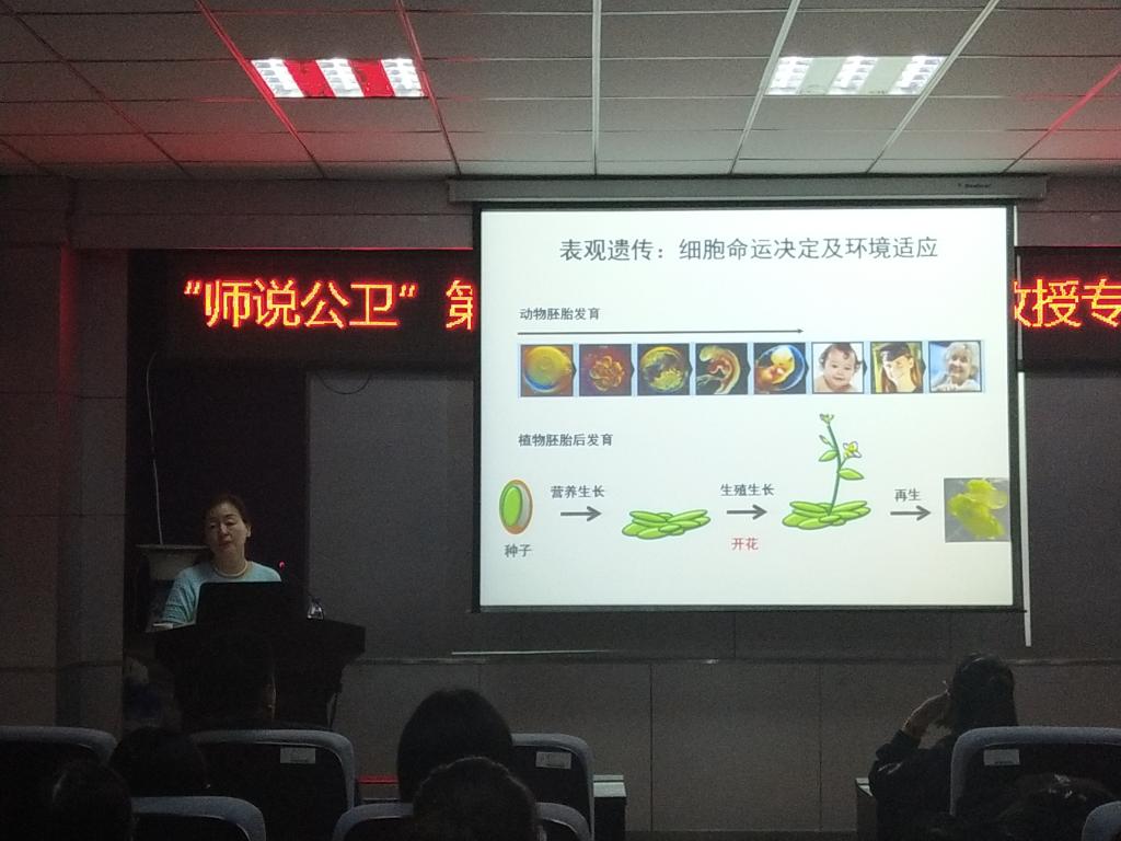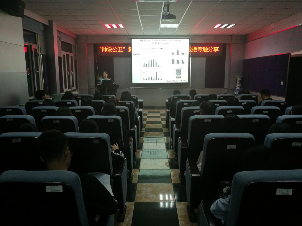 19时整,学院三楼报告厅座无虚席,简短的开场之后,讲座正式开始。讲座中,董爱武教授详尽地介绍了改变染色质结构的主要途径,包括不依赖ATP的组蛋白的掺入和移除、组蛋白的翻译后修饰、依赖ATP的染色体重组。她还讲解了表观遗传学的核心研究内容,包括DNA甲基化修饰、染色质结构变化、非编码RNA调控等,并以此为基础,围绕组蛋白甲基化修饰阅读蛋白精确调控拟南芥开花时间的分子机制展开深入、直观的分析。随后,董爱武教授还将表观遗传学联系到动物胚胎的发育过程中展开讨论,通过演示文稿上直观、简洁的画面,绘声绘色地向同学们讲解了专业知识。台下的同学们聚精会神地聆听着教授的讲座,在演讲的关键之处,不时地认真记录下了讲座中的精华。