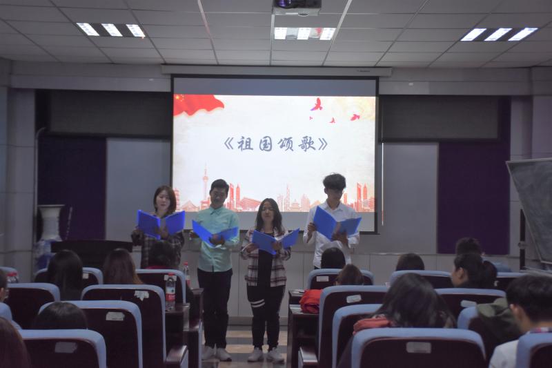 片刻之后,十名晋级选手的名单公布了。接下来,晋级的选手们需要随机抽取朗读文章,并在五分钟之内做好上台准备。紧张的准备时间过后,选手们依次上台朗诵,用诗词告白祖国,用声音致敬祖国。准备时间的短暂并没能影响他们饱含感情得朗诵,他们完美的表演赢得了观众们热烈的掌声。同样是在愉快的游戏环节后,主持人上台宣布了获奖选手的名单,并由霍睿老师、冷贺璇老师、曲景辉同学为获奖选手进行了颁奖。活动最后,参加活动的全体成员起立宣誓并合影留念。