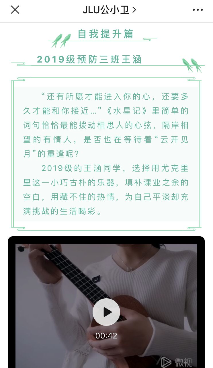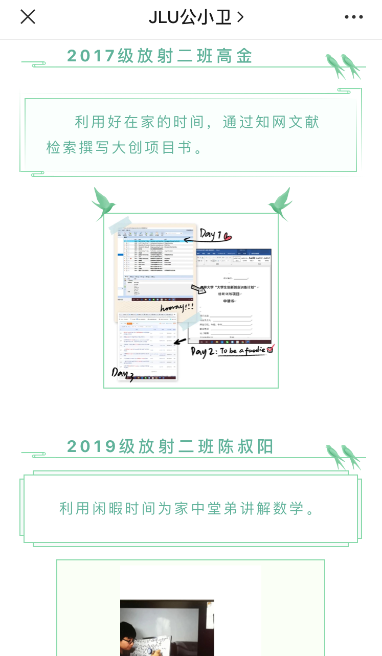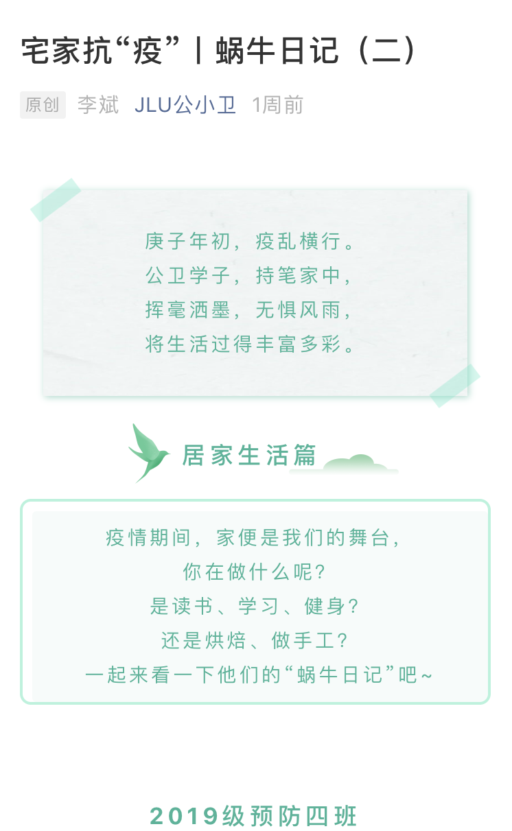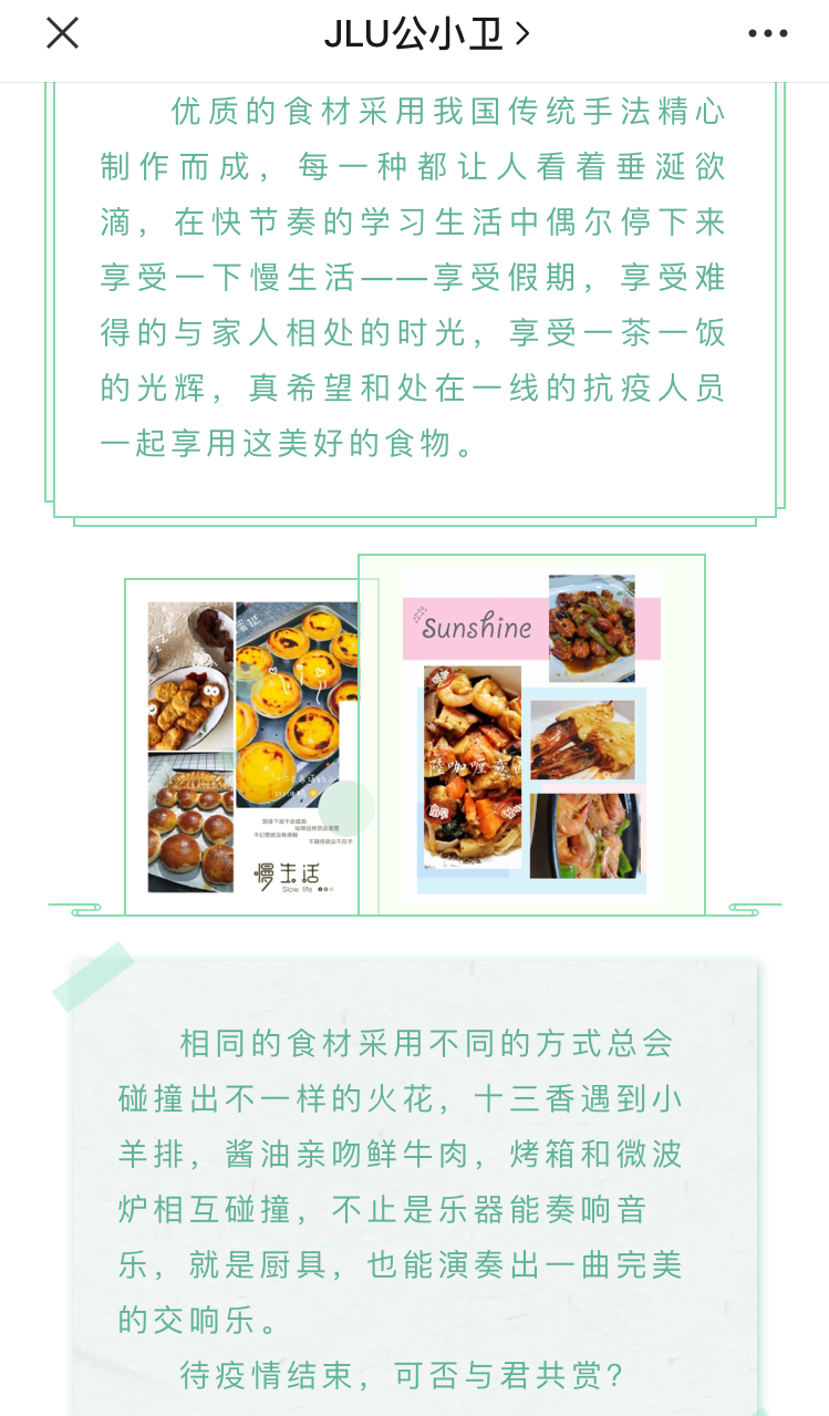 本次活动分为“居家日常”、“厨艺养成”、“学习生活”、“自我提升”、“社会实践”五个模板,报名的同学根据自己的喜好选择相应的模板提交作品。优秀作品在JLU公小卫平台推送中集中展示。2015级杨逸雪同学将她绣出的手帕展示给大家,一针一线下是对美好的期许;2016级何双双同学用阅读充实自己的生活,一书一文中是对思想的启迪;2017级万思雨同学正在为双学士论文而忙碌,柴昕宇同学开始了对新语言的学习;2018级万娟新同学不但学会了绣十字绣,还做出了美味可口的酱香饼,沈欣同学则拿起笔将大千世界描绘在了她的笔下;2019级陈叔阳同学心系高中生,利用空闲时间为他们解答疑惑、讲解试题,王涵同学则选择用尤克里里填补课业之余的空白……“蜗牛日记”仍在继续,相信它会带来更多同学们精彩有趣的生活风貌。