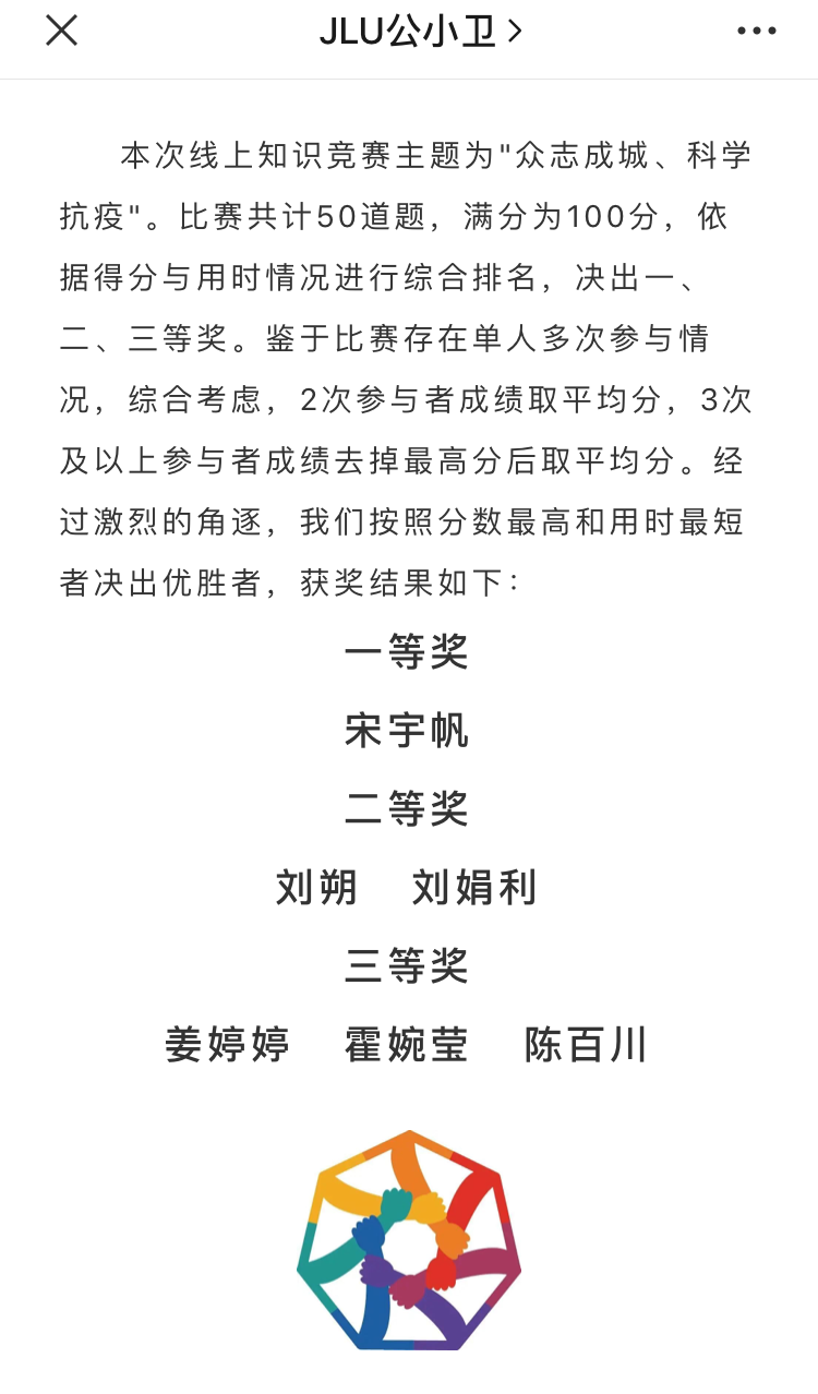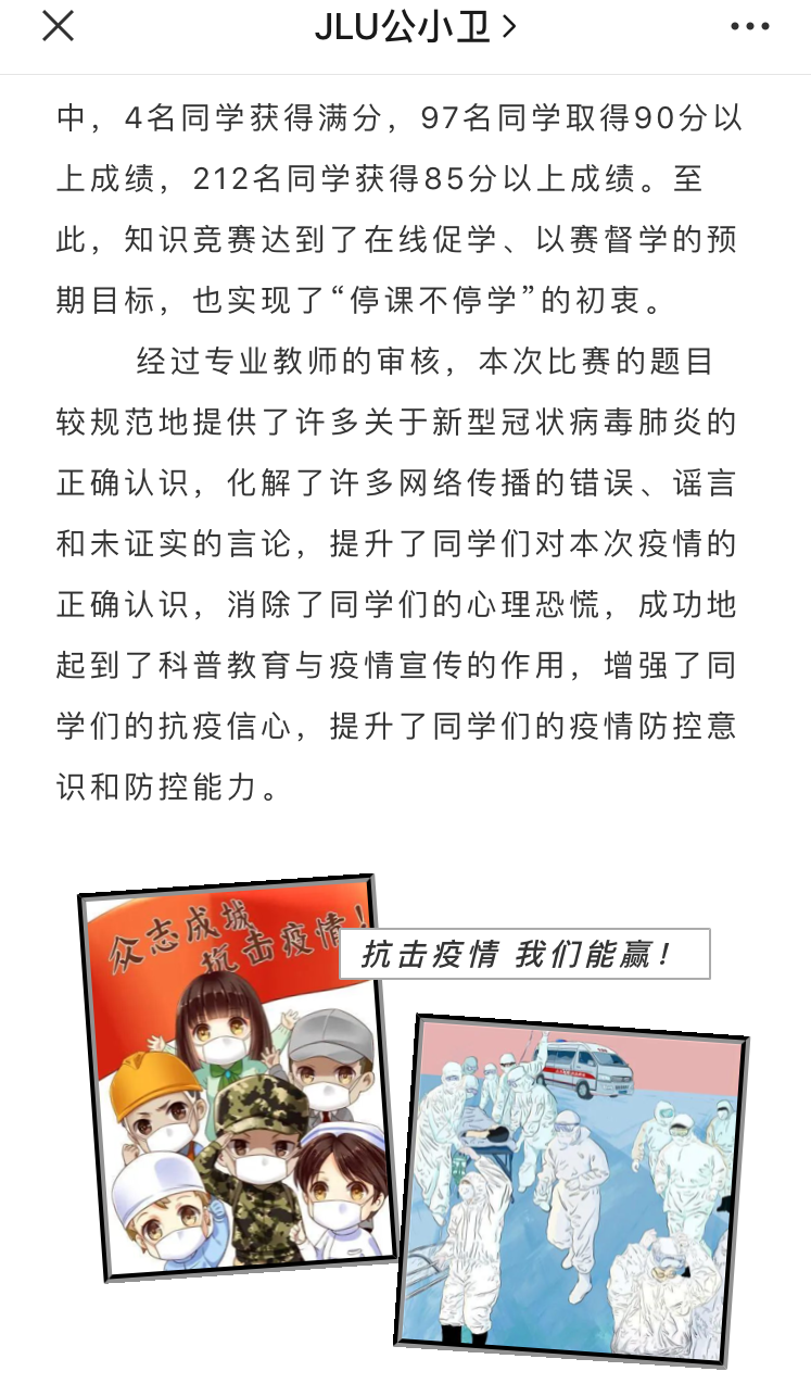 本次“众志成城 科学战疫”网络疫情防控知识竞赛真正做到了以赛促学,提升了公卫学子对此次新冠肺炎疫情的正确认识,增强了各位同学的防疫意识,培养公卫学子的专业素养,同时也坚定同学们学好专业课的信念。相信在不久的将来,会有一大批优秀的学子奔赴祖国各地,为祖国的健康事业贡献智慧和力量。