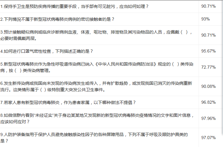 主办部门在活动开始前积极准备疫情相关问题,既要涉及多个方面,也要保持难度适中。参与比赛的同学们在微信公众号上进行线上答题,答完即时获得分数。系统根据分数高低和用时长短自动统计排名并形成排行榜,根据排行榜评选出一、二、三等奖共六人,并通过电子邮箱发送电子版活动奖状。本次活动学院全员参与,其中4人获得满分,共计212人取得了85分以上的好成绩。竞赛问题不仅有关于新冠肺炎的基础知识,还涵盖了病毒的传播方式、感染途径以及如何预防、如何自我隔离等内容,让同学们对新冠肺炎有了科学的认识,消除了同学们对疫情不必要的恐慌。