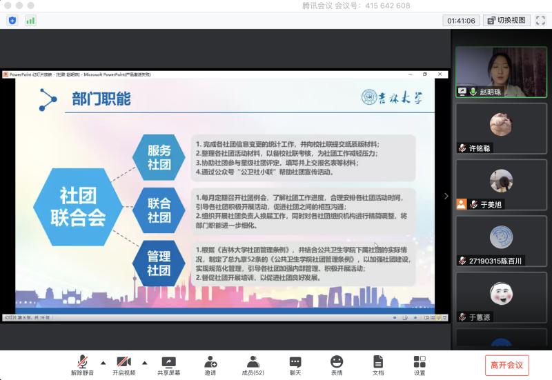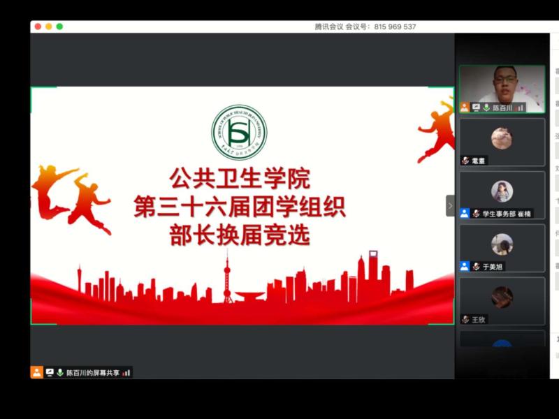 之后,学院分别于5月25日和5月28日在线举行了第三十六届团学组织部长、部员换届大会。各部门参选成员从总结工作经验出发,阐述了自身优势,并对未来工作发表了展望。结合在线投票结果,经学院研究决定,第三十六届团学组织主席团及成员名单在学院微信公众平台予以公示。